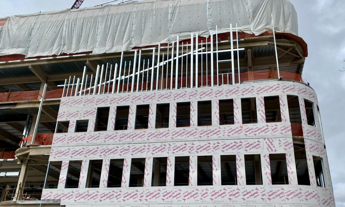 The project team executed detailed Building Information Modeling coordination during preconstruction to validate design intent and eliminate conflicts before installation began. Crews laid out walls to maintain the exterior sheathing plane while shifting cold-formed metal framing buildup to the building interior, helping maintain envelope tolerances and finish continuity.